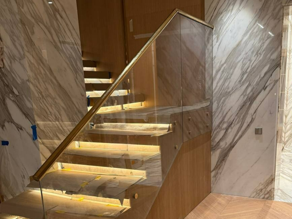 Материал: Стекло триплекс 6+6 и элегантный поручень из нержавеющей стали с покрытием «под золото» (нанесение нитрида титана).